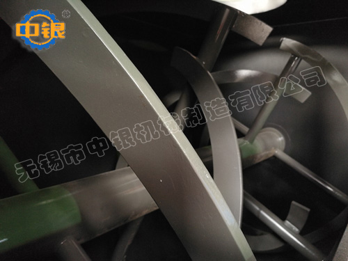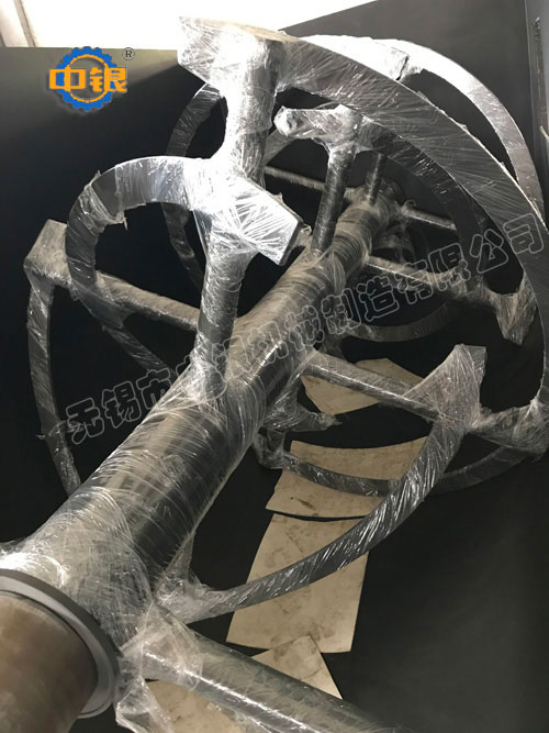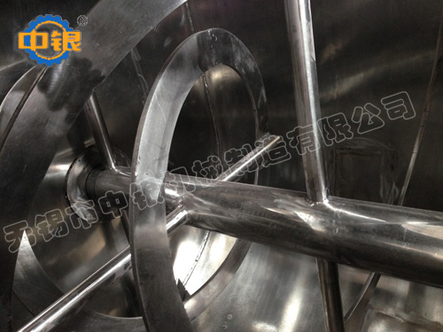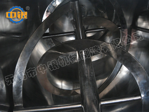 臥式螺帶混合機以高效、快速混合物料、由攪拌軸的螺旋帶運動下,使內外螺旋帶在較大范圍內翻動物料,內螺旋帶將物料向兩側運動,外螺旋帶將物料由兩側向內運動,使物料來回滲混,另部分物料被螺旋帶推動下,沒軸向徑向運動,從而形成對流循環(huán)。由于上述運動的攪拌,物料在較短時間內獲得快速均勻混合。